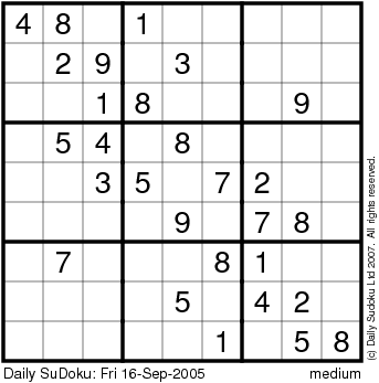 The Daily SuDoku: Fri 16-Sep-2005