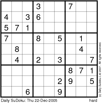 The Daily SuDoku: Thu 22-Dec-2005