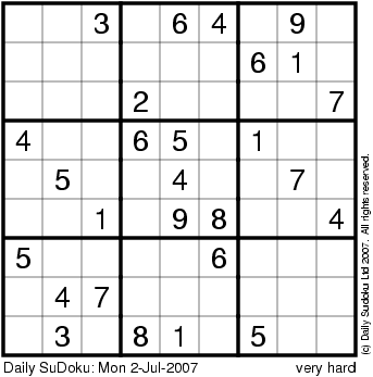 The Daily SuDoku: Mon 2-Jul-2007