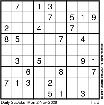 The Daily SuDoku: Mon 2-Nov-2009