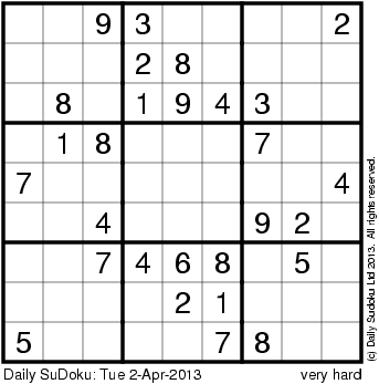 The Daily SuDoku: Tue 2-Apr-2013