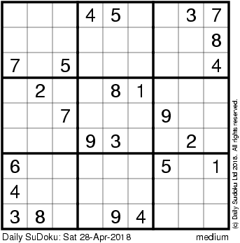 The Daily SuDoku: Sat 28-Apr-2018
