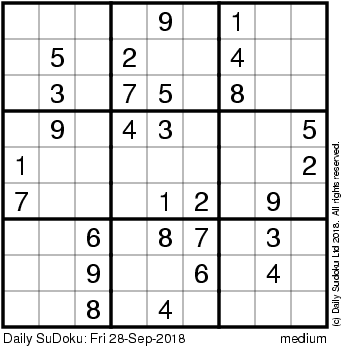 The Daily SuDoku: Fri 28-Sep-2018
