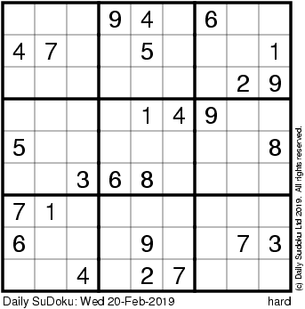 The Daily SuDoku: Wed 20-Feb-2019