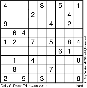 The Daily SuDoku: Fri 28-Jun-2019