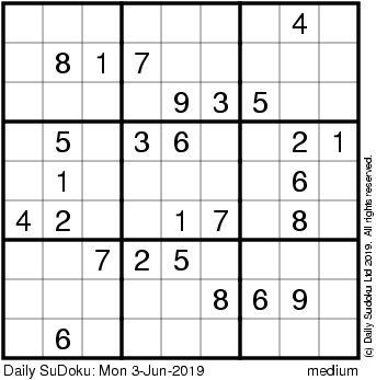 The Daily SuDoku: Mon 3-Jun-2019