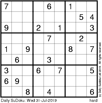 The Daily SuDoku: Wed 31-Jul-2019