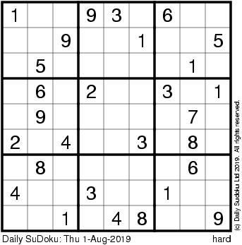 The Daily SuDoku: Thu 1-Aug-2019