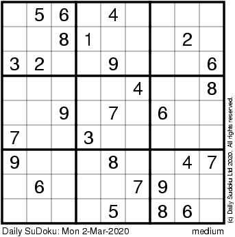 The Daily SuDoku: Mon 2-Mar-2020