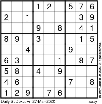 The Daily SuDoku: Fri 27-Mar-2020