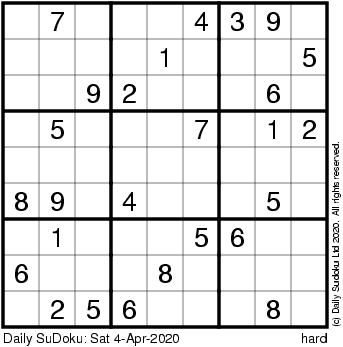 The Daily SuDoku: Sat 4-Apr-2020