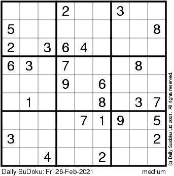The Daily SuDoku: Fri 26-Feb-2021