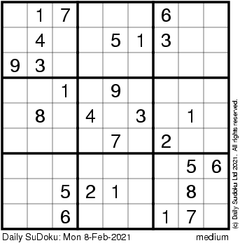 The Daily SuDoku: Mon 8-Feb-2021