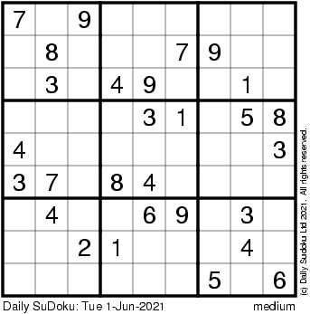 The Daily SuDoku: Tue 1-Jun-2021