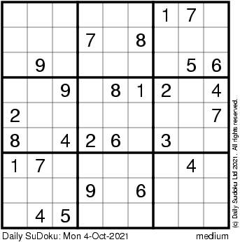 The Daily SuDoku: Mon 4-Oct-2021