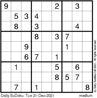 The Daily SuDoku: Tue 21-Dec-2021