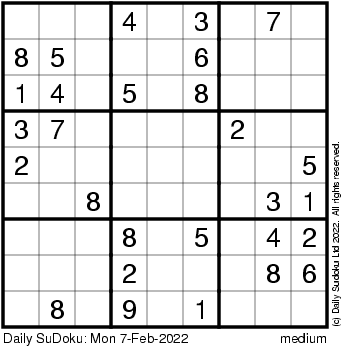 The Daily SuDoku: Mon 7-Feb-2022