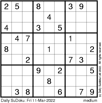 The Daily SuDoku: Fri 11-Mar-2022
