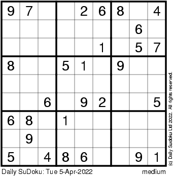 The Daily SuDoku: Tue 5-Apr-2022