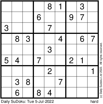 The Daily SuDoku: Tue 5-Jul-2022