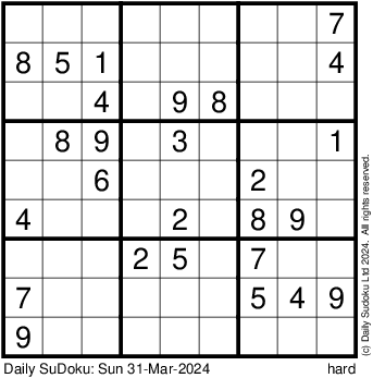 The Daily SuDoku: Sun 31-Mar-2024