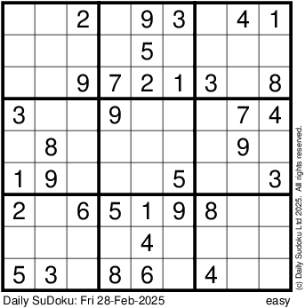 The Daily SuDoku: Fri 28-Feb-2025