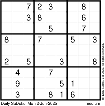 The Daily SuDoku: Mon 2-Jun-2025